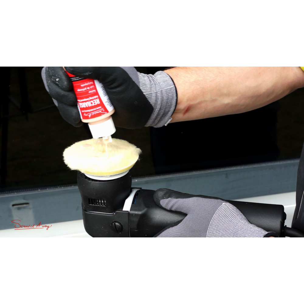 The unique multi-orbit-per-rotation and high-torque movements of the SAW195 machine can easily push a standard polishing compound past its breaking point, resulting in rough movements and prematurely dried compounds. Which lead to unpredictable finishing results. The multi-orbit properties created by the SAW195 required the development of a unique compound formula, one that provides sustained pad lubrication during renovating and properties that can handle the rapid changes and high torque. The result is Scratch Away Recharge yellow polishing compound; a formula specifically developed to work in harmony with the SAW195 machine delivering great and rapid results.